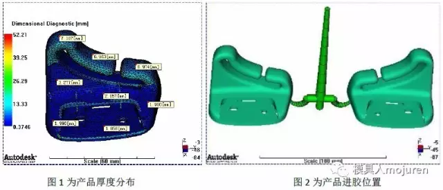 此產(chǎn)品為汽車安全帶固定件: 產(chǎn)品最大外形尺寸:70*45*63,產(chǎn)品平均肉厚:1.8~7.0mm,產(chǎn)品肉厚差異較大,因此采用3D網(wǎng)格分析,如圖1所示。材料:ABS+PA6-GF8 Terblend N NG-02 : BASF .此材料已做修正,質(zhì)量指示器為銀級(jí),此材料可信度較高。 模具為一模兩件,由于產(chǎn)品量大,因此進(jìn)膠方式為冷流道隧道澆口進(jìn)膠,如圖2所示。