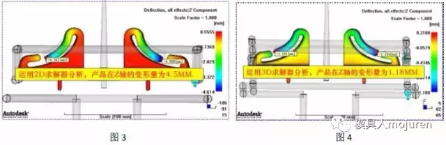 此產(chǎn)品雖有拐角,但不可使用雙層面網(wǎng)格含有拐角效應(yīng)的選項(xiàng)進(jìn)行分析,由于此產(chǎn)品的形狀、壁厚分部不均且壁厚變化較大已不符合使用雙層面網(wǎng)格的要求(在這里我用雙層面網(wǎng)格分析了一下,如圖3所示。分析出的變形高達(dá)4.5MM),因此采用3D網(wǎng)格分析,分析出來(lái)的產(chǎn)品最大變形為1.18MM,如圖4所示。
